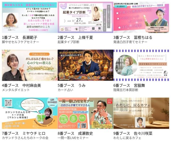 オンライン市場「LCマルシェ」は「20:00~23:00」で開設されます。いくつもの店舗ブレイクアウトルームに自由に入退室できます。市場をブラブラするように、ぜひ、いろんな店舗を覗いてみてください。(冷やかし入室、大歓迎です。)